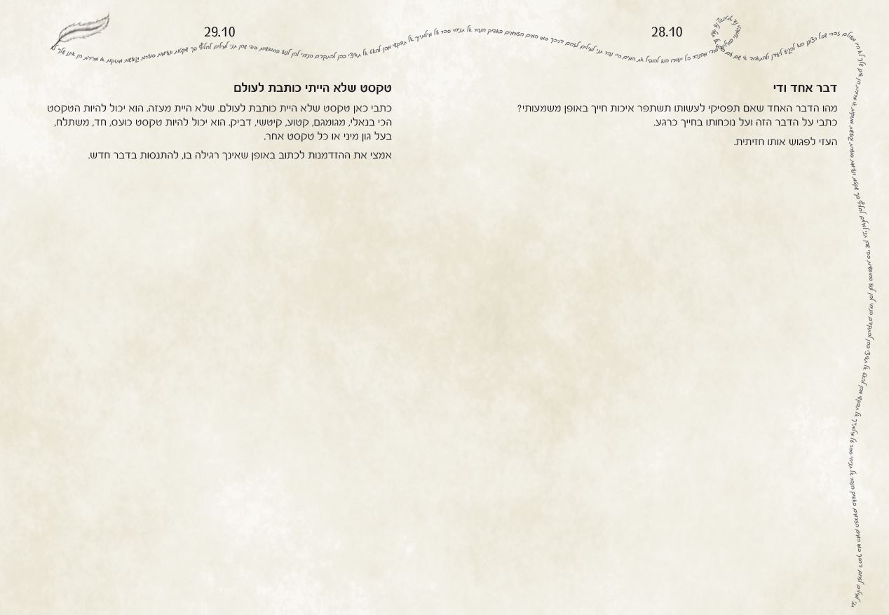 דרך התרגיל היומי, וטקסטים מעוררי השראה אני מזמינה אתכם ואתכן להעז ולצעוד פנימה, לבטא את רגשותיכם, תחושותיכם ומחשבותיכם בכתיבה אינטואיטיבית, סיפור, שיר או בכל דרך שתמצאו לנכון.